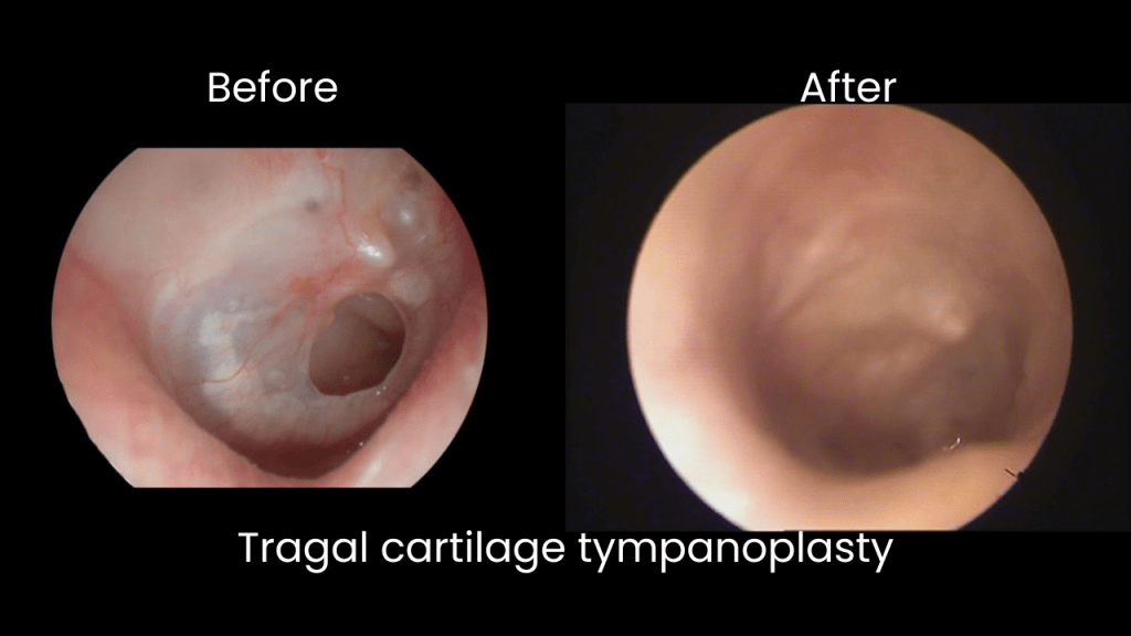 - Repair: The surgeon will use a graft material (Tragal cartilage or Temporalis fascia), to repair the eardrum.